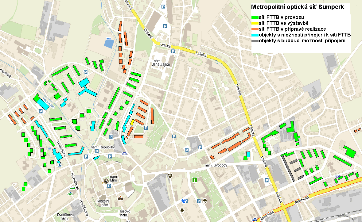 Projekt vybudování pasivní optické infrastruktury FTTB v Šumperku a Zábřehu na Moravě s využitím nejmodernější technologie přístupu k širokopásmovým službám vznikl v roce 2005 a v následujícím roce začala realizace sítí. První část projektu byla realizován s podporou Ministerstva informatiky ČR v rámci projektu podpory vysokorychlostního internetu. Metropolitní optická síť nabízí připojení vysokorychlostního internetu až do 100 Mbps. Technologie přístupu k internetu pomocí optické infrastruktury se vyznačuje dosažením vynikající latence (odezvy) při komunikaci mezi servery a koncovými PC (např. on-line hry), bezkonkurenčním potenciálem v možnosti okamžitého navyšování rychlostí až do 100/100Mbps. Projekt v Šumperku zahrnuje nasazení služby digitální kabelové televize (IPTV) pro účastníky až s 75 digitálními programy s možností připojení jakéhokoliv televizoru pomocí Set-top-boxu. Navíc služba IPTV umožní příjem bloku programů ve vysokém rozlišení (HDTV). Nasazení digitální televize (IPTV, DVB-C) v kompletní nabídce v Zábřehu se připravuje v návaznosti na územní řízení pro výkop optického propojení.